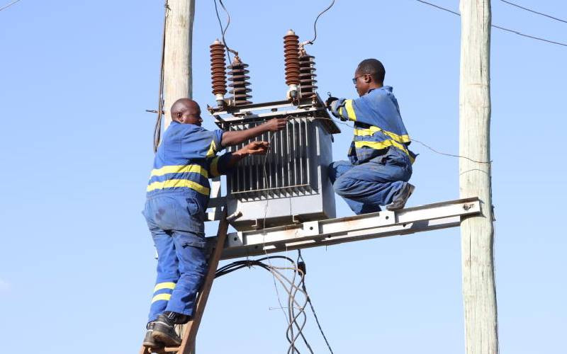 Kenya power technicians install a transformer at Ibutuka Village in Mbeere North in Embu County (Murithi Mugo, Standard)